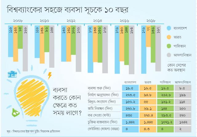 বিশ্বব্যাংকের ইজ অব ডুয়িং বিজনেস বা সহজে ব্যবসা সূচকে ১০ বছর আগে বাংলাদেশের বেশ পেছনে ছিল ভারত। এরপর বাংলাদেশ শুধু পিছিয়েছে। আর ভারত মাত্র তিন বছরে ৫৩ ধাপ এগিয়ে ৭৭তম অবস্থানে উঠে এসেছে। তলানিতে থাকা আফগানিস্তান পাঁচটি কাজ করে ১৬ ধাপ লাফ দিয়েছে। বিশ্বব্যাংক ২০০৮ সালে যে ডুয়িং বিজনেস প্রতিবেদন প্রকাশ করে, তাতে বাংলাদেশের অবস্থান