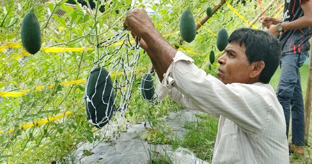 নওগাঁর পত্নীতলা, মহাদেবপুর, রাণীনগর ও সদর উপজেলার মাঠে মাঠে এখন নতুন এক স্বাদ ও রঙের আমেজ দেখা যাচ্ছে। যেখানে আগে পটল ও করলা চাষ হত, সেখানে এখন বর্ষাকালীন সময়ের জন্য জনপ্রিয় হয়েছে মার্সেলো জাতের তরমুজ। মাঠে মাচার ওপর সবুজ পাতার পাশে ঝুলে থাকা কালো রঙের তরমুজগুলো অত্যন্ত আকর্ষণীয়। গাছ থেকে ছিঁড়ে না পড়া যাতে নিশ্চিত