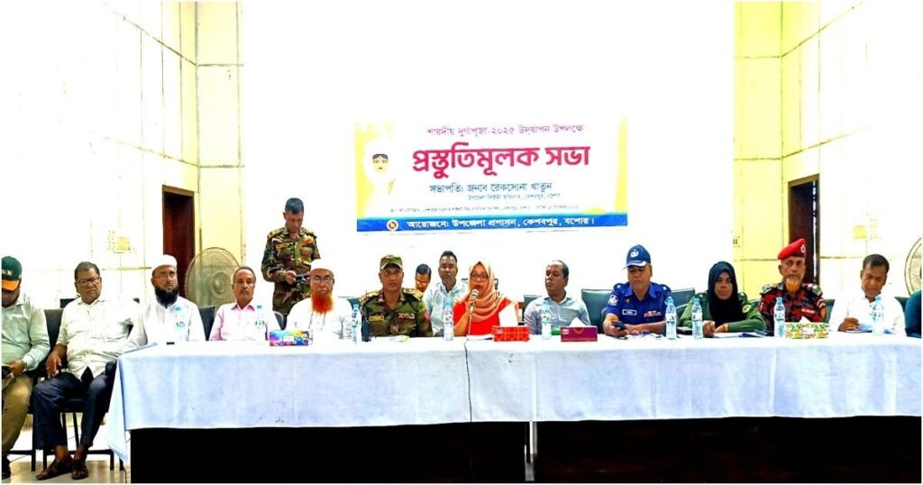যশোরের কেশবপুর উপজেলায় উৎসবমুখর পরিবেশে শারদীয় দুর্গাপূজা উদযাপনের প্রস্তুতি হিসাবে একটি গুরুত্বপূর্ণ সভা অনুষ্ঠিত হয়েছে। বুধবার (১৭ সেপ্টেম্বর) বিকেলে উপজেলা প্রশাসনের উদ্যোগে কেশবপুর সরকারি পাইলট উচ্চ বিদ্যালয়ের অডিটোরিয়ামে এই প্রস্তুতিমূলক সভা আয়োজিত হয়। সভায় সভাপতিত্ব করেন উপজেলা নির্বাহী অফিসার মোছাঃ রেকসোনা খাতুন। উপস্থিত ছিলেন উপজেলা সহকারী কমিশনার (ভূমি) শরীফ নেওয়াজ, সেনাবাহিনী ওয়ারেন্ট অফিসার ফখরুল ইসলাম,