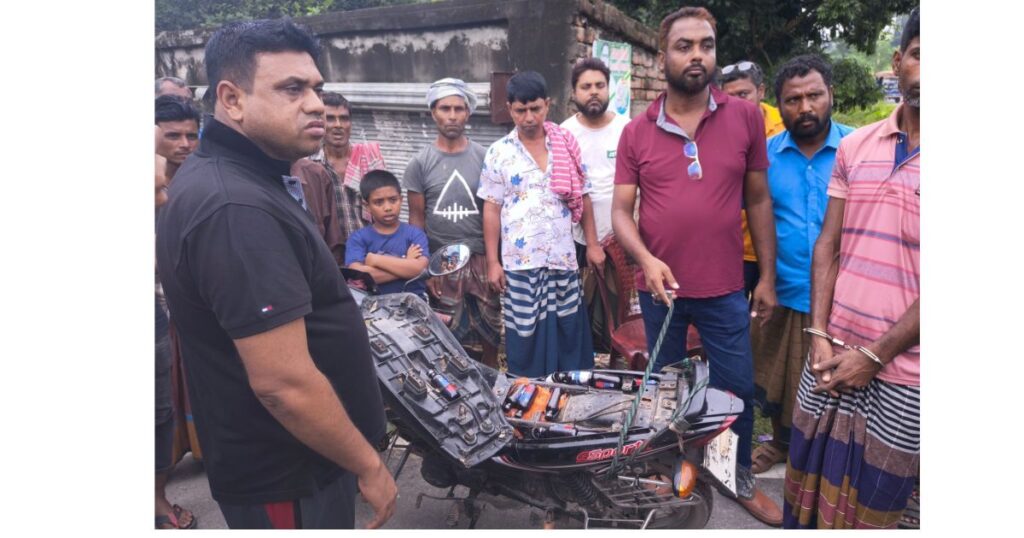 মেহেরপুরের গাংনীতে অভিনব কায়দায় মটরসাইকেলে করে ফেনসিডিল পরিবহন করার সময় পুলিশ ৪৫ বোতল ফেনসিডিলসহ একজন মাদক কারবারিকে আটক করেছে। ঘটনাটি ঘটে আজ সোমবার সকাল সাড়ে নয়টার দিকে, গাংনী উপজেলার ছাতীয়ান ব্রিক ফিল্ড বাজারের তিন রাস্তার মোড়ে। জ্যেষ্ঠ পুলিশ কর্মকর্তা ওসি শিমুল বিশ্বাস জানান, তারা গোপন সংবাদের ভিত্তিতে জানতে পারেন যে, ওই বাজার দিয়ে এক মাদক ব্যবসায়ী কোনভাবে মাদক পাচার করছে। এর ফলে তারা আগে থেকেই সেখানেই সিভিল ড্রেসে অবস্থান নেয়। এবং কর্তব্যরত পুলিশের ট্র্যাফিক পুলিশ একটি TVSmetro মটরসাইকেল আটকের পর তল্লাশি চালায়। তল্লাশি চালিয়ে মটরসাইকেলের সিট কভার নিচে থরে থরে সাজানো ৪৫ বোতল ফেনসিডিল উদ্ধার করা হয়। মদসহ এই মাদক পরিবহনে ব্যবহৃত মটরসাইকেলটিকে জব্দ করাসহ, আসামি লিপন হোসেনকে গাংনী থানায় নিয়ে আসা হয়। আটককৃত লিপনের বয়স ৩২ বছর এবং তার পৈত্রিক নিবন্ধন কুষ্টিয়া জেলার দৌলতপুর উপজেলার তেকালা পশ্চিম পাড়ায়। পুলিশ আরও জানিয়েছে, আসামির বিরুদ্ধে আইনি ব্যবস্থা গ্রহণের জন্য তাকে আদালতের আওতায় পাঠানো হবে। এই ঘটনায় জড়িত অন্যান্য সরাসরি সংশ্লিষ্টদের খোঁজ চালানো হচ্ছে।