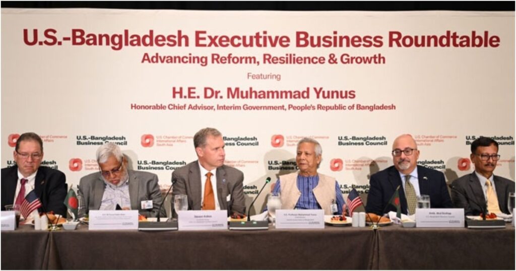 প্রধান উপদেষ্টা অধ্যাপক মুহাম্মদ ইউনূস যুক্তরাষ্ট্রের শীর্ষ প্রতিষ্ঠানগুলোকে বাংলাদেশে আরও বিনিয়োগের জন্য উত্সাহিত করেছেন। বুধবার নিউইয়র্কে অনুষ্ঠিত যুক্তরাষ্ট্র-বাংলাদেশ এক্সিকিউটিভ বিজনেস গোলটেবিল আলোচনায় তিনি এই আহ্বান জানান। এই আলোচনার শিরোনাম ছিল ‘অ্যাডভান্সিং রিফর্ম, রেজিলিয়েন্স অ্যান্ড গ্রোথ’, যা ইউএস-বাংলাদেশ বিজনেস কাউন্সিল (ইউএসবিবিসি) আয়োজিত। প্রধান উপদেষ্টা বলেন, মার্কিন কোম্পানি যেমন মেটলাইফ, শেভরন ও এক্সেলারেটের মতো শীর্ষ মার্কিন সংস্থাগুলোর