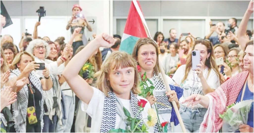 থুনবার্গ অভিযোগ করেন, ‘বিশ্ব ব্যবস্থাই ফিলিস্তিনিদের সঙ্গে বিশ্বাসঘাতকতা করছে। যুদ্ধাপরাধগুলো রোখার জন্য তারা কিছুই করতে পারে না। আমাদের সরকারগুলোর অনীহায় আমরা গ্লোবাল সুমুদ ফ্লোটিলার মাধ্যমে কিছু করার চেষ্টা করেছি।’