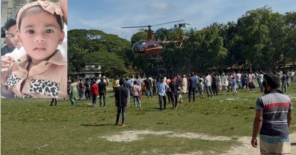 কুমিল্লার চৌদ্দগ্রাম উপজেলার আলকরা ইউনিয়নের লক্ষীপুর গ্রামে পানিতে ডুবে মারা গেছেন তিন বছর বয়সী শিশু আরওয়া। এই দুঃখজনক ঘটনায় বিশেষ Rückschlag অনুভব করেছেন বাবা ওসমান গনি, যিনি আফ্রিকা প্রবাসী। মেয়ের মৃত্যুর খবরে তিনি যেন ভেঙে পড়লেন, তারই দেখা মিলল যখন তিনি শ্রদ্ধা জানাতে মেয়ের শেষ দর্শনে হেলিকপ্টার যোগে ছুটে আসেন। শুক্রবার বিকেলে গ্রামের গুণবতী স্কুল