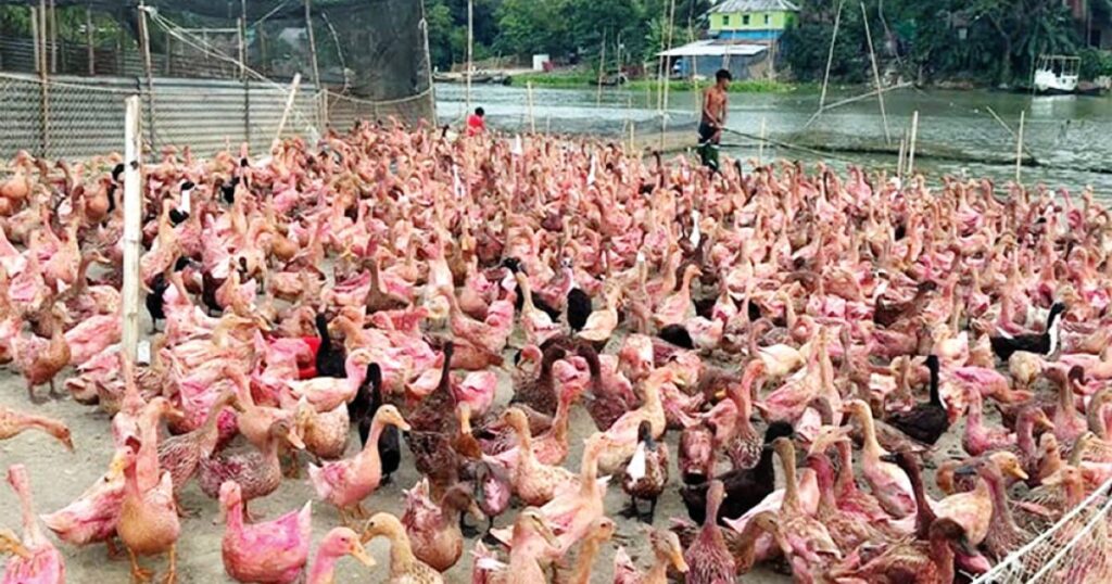 কিশোরগঞ্জ জেলার নিকলী উপজেলার ঘোড়াউত্রা নদীর দু পাশে লক্ষাধিক হাঁসের খামার দৃশ্যमान। বাঁশের খুঁটি ও জালের দিয়ে ঘেরা এসব অস্থায়ী পুকুরে সারাদিন দেশি প্রজাতির হাঁসরা সাঁতার কাটে। রাতে তারা নদীর ধারে নির্মিত ছোট ছোট ঘরে বিশ্রাম নেয়। খামারিরা বলছেন, কম পুঁজিতেই সহজলভ্য প্রাকৃতিক খাদ্য যেমন শামুক ও ঝিনুকের সাহায্যে এই শিল্পে লাভের সুযোগ তৈরি হচ্ছে, যাতে অনেকের জীবনধারা বদলাচ্ছে।
