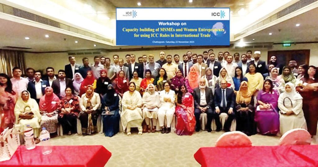 ইন্টারন্যাশনাল চেম্বার অব কমার্স (আইসিসি) বাংলাদেশ রোববার চট্টগ্রামের এক শীর্ষস্থানীয় হোটেলে এক দিনব্যাপী কর্মশালার আয়োজন করে, যা পরিবারের সদস্যদের জন্য আন্তর্জাতিক বাণিজ্যে আইসিসির নিয়মাবলি শেখানোর লক্ষ্যে পরিচালিত। এই উদ্যোগের উদ্দেশ্য হলো এসএমই ও নারী উদ্যোক্তাদের মাঝে আন্তর্জাতিক বাণিজ্যে প্রয়োজনীয় দক্ষতা বৃদ্ধি করা, যাতে তারা বিশ্ববাজারে আরও কার্যকরভাবে নিজেদের পণ্য রপ্তানি করতে পারে।