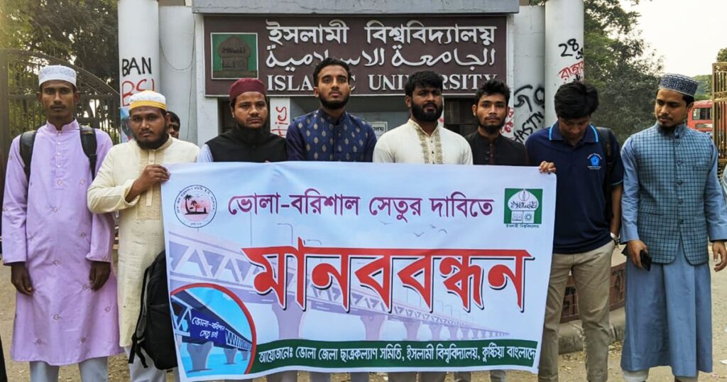 কুষ্টিয়ার ইসলামী বিশ্ববিদ্যালয় (ইবি) ছাত্রছাত্রীরা ভোলা-বরিশাল সেতু নির্মাণের দাবি নিয়ে মানববন্ধন করেছে। রোববার সকাল সকাল বিশ্ববিদ্যালয়ের প্রধান ফটকের সামনে এ কর্মসূচি অনুষ্ঠিত হয়। কর্মসূচিতে অংশগ্রহণকারীরা বলেন, বরিশাল জেলাকে ভোলা জেলার সাথে যুক্ত করার জন্য দীর্ঘদিন ধরে উঠছে এই দাবি। ভোলা হলো বাংলাদেশের একটি দ্বীপাঞ্চল, যেখানে প্রায় ৫৬ লাখ টাকার মূল্যমানের গ্যাস মজুত রয়েছে। রাষ্ট্র এই সম্পদ থেকে সুবিধা নিচ্ছে, কিন্তু সাধারণ মানুষের জন্য কোনো বৈষম্য দেখা যাচ্ছে না। তারা আরও জানান, ভোলা এলাকায় চিকিৎসাসেবার অবস্থা নাজুক। সেখানে কোনও রোগী যদি বরিশালে রেফার করতে হয়, তবে ঝড়-তুফান বা খারাপ আবহাওয়ার কারণে নদীপথে যাত্রা অনেক সময় ঝুঁকিপূর্ণ হয়ে পড়ে, যা মানুষের জীবনের জন্য বিপজ্জনক। শিক্ষার্থীরা বলেন, ভোলা ও বরিশাল জেলার মধ্যে সেতুর মাধ্যমে যোগাযোগের উন্নয়ন সময়ের দাবী। তারা দীর্ঘদিন ধরে এই দাবি জানিয়েই আসছেন। তবে ইতিপূর্বে সেতু নির্মাণের জন্য ভোলা জেলায় অবস্থান নেওয়া উপদেষ্টা সরকারি প্রতিশ্রুতি দিয়েছিলেন যে, ডিসেম্বর বা জানুয়ারির মধ্যে কাজ শুরু হবে। কিন্তু তারা সেই প্রতিশ্রুতি রক্ষা করতে পারেননি; পরিবেশগত সমস্যা নামিয়ে দিয়ে এপ্রিলে শুরু করার কথা বলছেন। তারা বলেন, মানুষের জীবন রক্ষার জন্য আগে ব্যবস্থা নিতে হবে। ভোলা থেকে বাংলাদেশ সরকারের অর্থনীতি সমৃদ্ধ করতে সম্পদ পাচ্ছে, কিন্তু সেই সুবিধার বিনিময়ে কিছুই পাচ্ছে না জেলা। ১৭ হাজার কোটি টাকায় সেতু নির্মাণের উদ্যোগ নেওয়া হয়েছে, তবে এখনও বাস্তবায়নে অগ্রগতি দেখা যায়নি। শিক্ষার্থীরা আশাবাদ ব্যক্ত করে বলেন, ইন্টিরিম সরকারের প্রতি তাদের আস্থা রয়েছে। ভোলা-বরিশাল সেতু নির্মাণ হলে দেশের অর্থনৈতিক উন্নতিতে গুরুত্বপূর্ণ অবদান রাখবে এবং আশা প্রকাশ করেন যে, এটি আশার নতুন আলো দেখাবে।