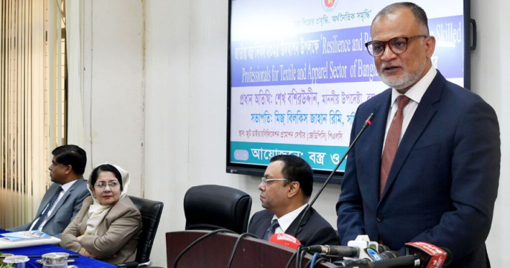 বৃহস্পতিবার রাজধানীর জুট ডাইভারসিফিকেশন প্রকল্পের প্রচেষ্টায় আয়োজিত ‘জাতীয় বস্ত্র দিবস-২০২৫’ উদযাপন অনুষ্ঠানে প্রধান অতিথির ভাষণে এসব কথা বলেন তিনি। এই সেমিনারের শিরোনাম ছিল ‘রেজিলিয়েন্স অ্যান্ড রেইনভেনশন: ক্রিয়েটিং স্কিল্ড প্রফেশনালস ফর দ্য টেক্সটাইল অ্যান্ড অ্যাপারেল সেক্টর অব বাংলাদেশ’। অনুষ্ঠানে সভাপতিত্ব করেন বস্ত্র ও পাট সচিব বিলকিস জাহান রিমি।