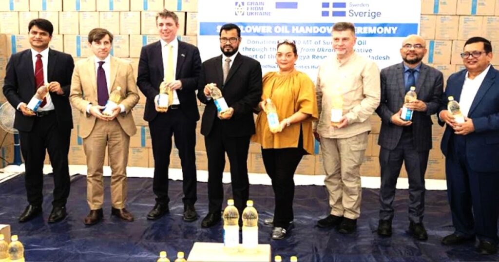 মিয়ানমার থেকে বাস্তুচ্যুত রোহিঙ্গা জনগোষ্ঠীর খাদ্য সহায়তা নিশ্চিত করতে ইউক্রেনের মানবিক উদ্যোগ ‘গ্রেইন ফ্রম ইউক্রেন’ কর্মসূচির আওতায় বাংলাদেশের জন্য ৩,০০০ মেট্রিক টন সূর্যমুখী তেল আনুষ্ঠানিকভাবে হস্তান্তর করা হয়েছে। এই গুরুত্বপূর্ণ সাহায্য কক্সবাজারের উখিয়া জেলায় অবস্থিত মধুরছড়া লজিস্টিক হাবে এক অনুষ্ঠানের মাধ্যমে সম্পন্ন হয়। এই অনুষ্ঠানে বাংলাদেশ সরকার, ইউক্রেন ও সুইডেনের দূতাবাস এবং জাতিসংঘের বিশ্ব খাদ্য