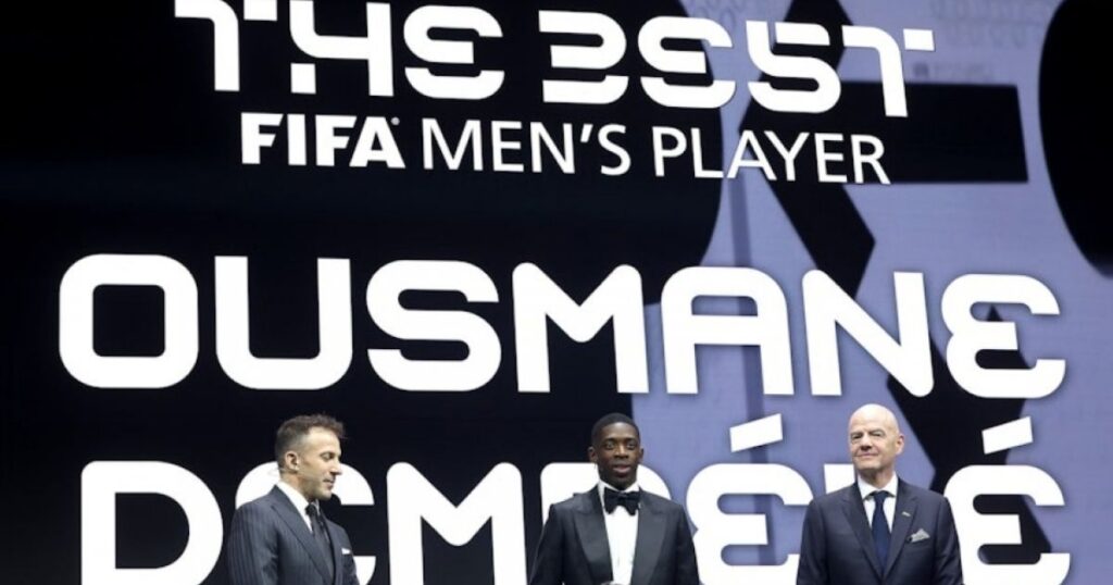 গত সেপ্টেম্বরের ব্যালন ডি’অর জয়ীর পর এবার ফিফার বর্ষসেরা পুরস্কারও জিতে নিলেন প্যারিস স্ট-জার্মেই (পিএসজি) ও ফ্রান্সের তারকা ফরোয়ার্ড উসমান দেম্বেলে। তার এই একটি রাতের জন্য ইতিহাসের বানানে লেখা হয়ে গেছে, কারণ এই পুরস্কার অর্জনের মাধ্যমে তিনি প্রমাণ করে দিয়েছেন, তিনি বিশ্বের সেরা একজন ফুটবল খেলোয়াড়। কাতারের দোহায় মঙ্গলবার এক সুসজ্জিত অনুষ্ঠানে, যেখানে ফিফা সভাপতি জিয়ান্নি ইনফান্তিনোসহ প্রায় ৮০০ অতিথি উপস্থিত ছিলেন, দেম্বেলেকে পুরস্কৃত করা হয়। একই অনুষ্ঠানে নারী বিভাগের জন্য ফিফা দ্য বেস্ট পুরস্কার পান বার্সেলোনার স্প্যানিশ মিডফিল্ডার আইতানা বোনমাতি।