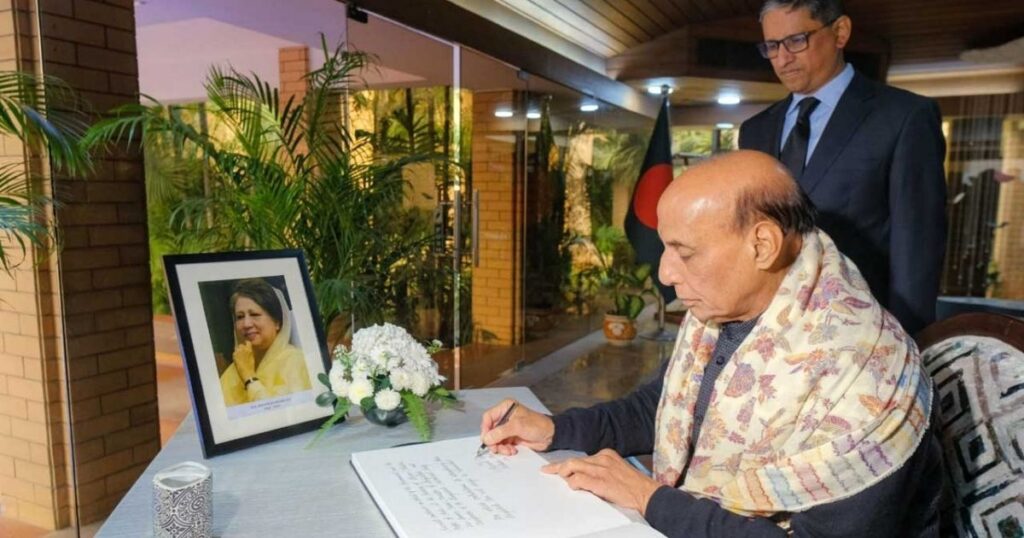 ভারতের কেন্দ্রীয় প্রতিরক্ষামন্ত্রী রাজনাথ সিং বৃহস্পতিবার সকালে দিল্লিতে অবস্থিত বাংলাদেশ হাইকমিশনে উপস্থিত হয়েছেন, বাংলাদেশে সাবেক প্রধানমন্ত্রী বেগম খালেদা জিয়ার মৃত্যুতে গভীর শোক ও শ্রদ্ধা জানাতে। তিনি সেখানে উপস্থিত হয়ে মরহুমার স্মৃতির প্রতি সম্মান জানিয়ে শোক বইয়ে স্বাক্ষর করেছেন। এই সময় হাইকমিশনে বাংলাদেশের রাষ্ট্রদূত রিয়াজ হামিদুল্লাহ উপস্থিত ছিলেন। রাজনীতির দিক থেকে ভারতীয় এই শীর্ষনেতার এই সফরটি