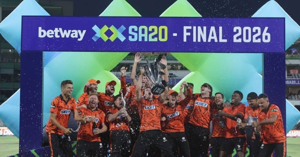 দক্ষিণ আফ্রিকার ঘরোয়া টি-টোয়েন্টি লিগ এসএ২০-এ চতুর্থ আসরেও নিজেদের আধিপত্য বজায় রেখেছে সানরাইজার্স ইস্টার্ন কেপ। সোমবার (২৬ জানুয়ারি) নিউল্যান্ডসে অনুষ্ঠিত এক নাটকীয় ও শ্বাসরুদ্ধকর ফাইনালে তারা প্রিটোরিয়া ক্যাপিটালসকে ৬ উইকেটে হারিয়ে গত চার বছরে তৃতীয় শিরোপা জিতল। ম্যাচে প্রথমার্ধে প্রতিপক্ষের ব্যাটার ডেভাল্ড ব্রেভিসের অসাধারণ শতক ও রানের জন্য দলটি বিপদে পড়ে। তবে পঞ্চম উইকেটে ম্যাথু