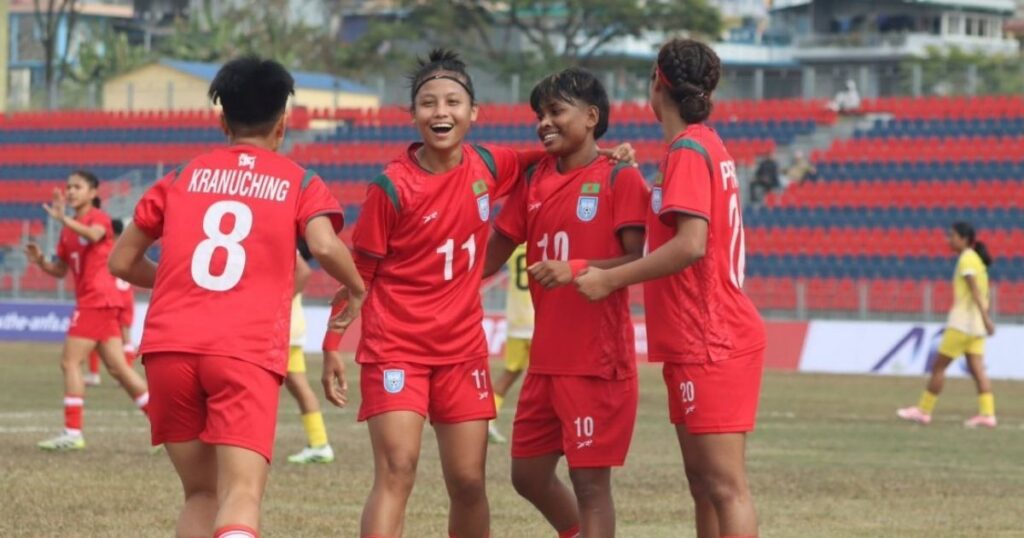 সাফ অনূর্ধ্ব-১৯ নারী চ্যাম্পিয়নশিপে নিজেদের আধিপত্য দেখিয়ে দুর্দান্ত শুরু করেছে বাংলাদেশের নারী ফুটবলাররা। আজ শনিবার নেপালের পোখরায় অনুষ্ঠিত টুর্নামেন্টের উদ্বোধনী ম্যাচে ভুটানকে ১২-০ গোলে পরাজিত করে লাল-সবুজের প্রতিনিধিরা। এই ঐতিহাসিক জয়ে দুই ফরোয়ার্ড মুনকি আক্তার ও তৃষ্ণা রানী জোড়া হ্যাটট্রিক করার পাশাপাশি দলের প্রতিটি খেলোয়াড় অসাধারণ পারফরম্যান্স দেখিয়েছেন। ভুটানের রক্ষণভাগ এই ম্যাচে কিংবা কোথাওই দাঁড়াতেই