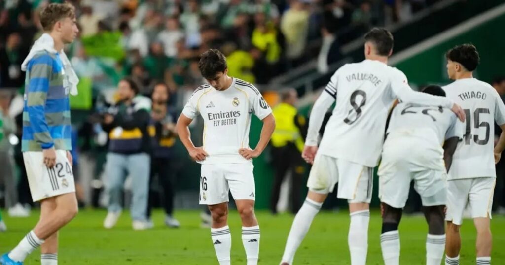 স্প্যানিশ লা লিগার শিরোপা ধরে রাখার মিশনে বড়সড় এক ধাক্কা খেল রিয়াল মাদ্রিদ। শুক্রবার রাতে রিয়াল বেটিসের মাঠে শেষ মুহূর্তের নাটকীয়তায় ১-১ গোলের ড্র নিয়ে মাঠ ছাড়তে হয়েছে আলভারো আরবেলোয়ার শিষ্যদের। ম্যাচের নির্ধারিত সময় পর্যন্ত জয়ের আশা জাগিয়ে রাখলেও যোগ করা সময়ের চতুর্থ মিনিটে গোল হজম করায় পূর্ণ পয়েন্ট পাওয়া সম্ভব হয়নি লস ব্লাঙ্কোসদের পক্ষে।